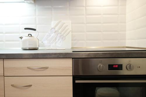 This apartment has a kitchen, electric kettle and kitchenware. |