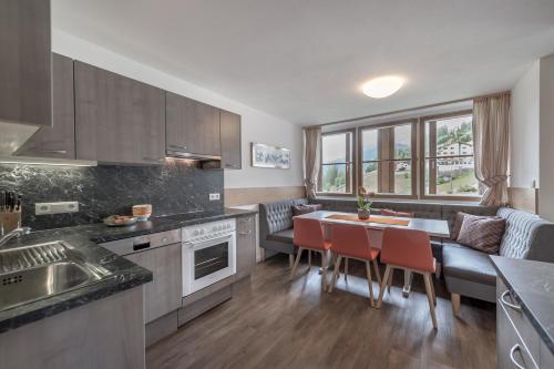 This east-facing apartment includes 2 en-suite double rooms, a small kitchen and a cosy winter garden with a dining area. |