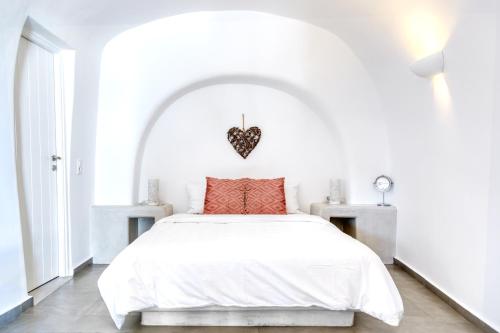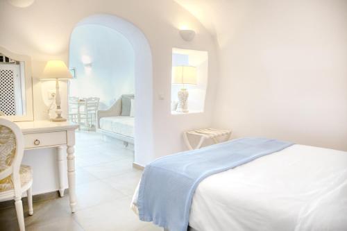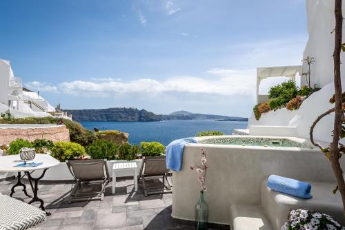 Opening to a large terrace with full views to the volcano, Caldera and the Aegean Sea, this studio consists of a bedroom with seating, kitchenette and private bathroom. A hot tub is also available. |