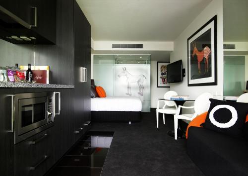 This suite has views over Melbourne city and offers a spacious living and dining area with flat-screen TV, sofa and iPod docking station. Features an open plan kitchenette, 2 bathrooms and a balcony with sun lounges and BBQ. Includes complimentary smart car hire, booking is required. Please note that the room rate is based on 2 guests. Maximum occupancy is 3 guests. Strict entertainment policy applies for this room category. |