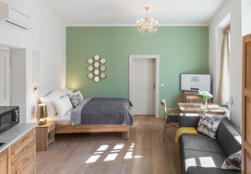 This apartment features a kitchenette, microwave and seating area. There is a sofa bed (for 2 people to sleep on) available for a surcharge in this room type, as well as an extra single bed. |