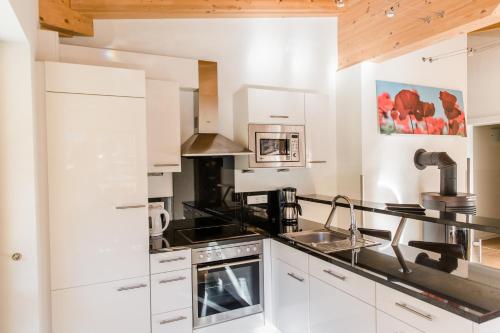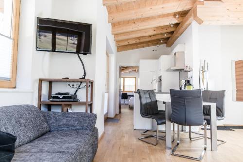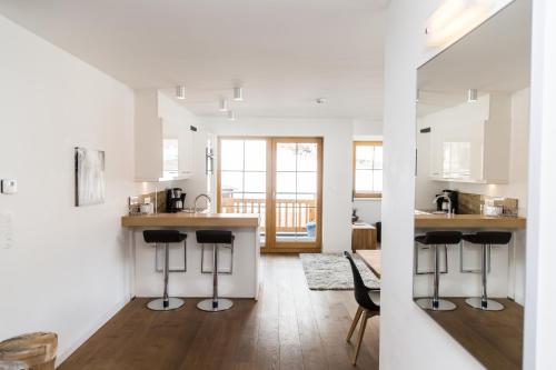 This apartment consists of 2 double bedrooms, 2 bathrooms, and a separate living room with a sofa bed. The kitchenette is equipped with a dishwasher. It has a large private balcony. Amenities include a flat-screen satellite TV. The apartments are well furnished with wooden beams, parquet floors and floor heating. |