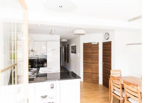 This apartment consists of 2 double bedrooms, 2 bathrooms, and a separate living room with a sofa bed. The kitchenette is equipped with a dishwasher. It has access to a large private patio facing south. Amenities include a flat-screen satellite TV in both bedrooms, as well as an LED TV with Playstation 3 and Blu-ray player. The apartments are well furnished with parquet floors and floor heating. |