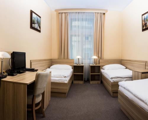 This room has 3 single beds and comes with a work desk and cable TV. |