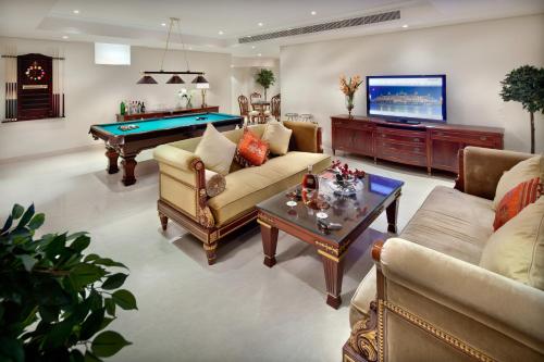 Offering direct beach access, this modern suite opens onto a terrace overlooking a private garden and the Palm Jumeirah lagoon. It includes a spacious living area with a large flat-screen TV, Bose sound system, and iPod docking station. There is a games room and a home theatre. Extra bedrooms for the nanny and driver are available. |