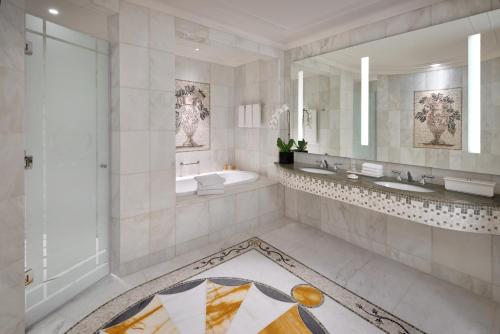 Spacious, bright and elegant, these spacious 130 sqm suites offer a separate living room with a large flat screen TV and dining area. The bedroom offers a King size bed. Opposite of the bed lies a 55 inch flat-screen TV and on the side table is an in-room control panel where you can change the lighting, open/close curtains, listen to radio though a touch. There is a work desk with media connectivity panel. The room has a big walk-in closet with an iron. There is a minibar in the room, with complimentary water bottles and tea and coffee making facilities. The bathroom offers a separate rainforest shower and large bath tub and complimentary Versace toiletries. - Suite Benefits • Meeting room access for two hours once per stay (subject to availability) |
