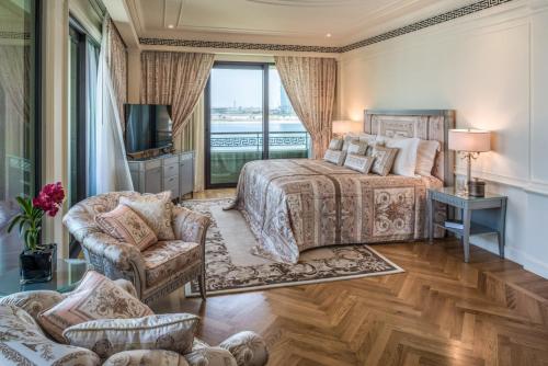The spacious, bright and elegant suite offers a living area with a large flat screen TV and dining area. The bedroom offers a king-size bed. Opposite of the bed lies a 55 inch flat-screen TV and on the side table is an in-room control panel where you can change the lighting, open/close curtains, listen to radio though a touch. There is a work desk with media connectivity panel. The room has a big walk-in closet with an iron. There is a minibar in the room, with complimentary water bottles and tea and coffee making facilities. The bathroom offers a separate rainforest shower and large bath tub and complimentary Versace toiletries. - Suite Benefits • Interconnected rooms are available. |