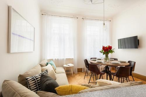 The apartment boasts free WiFi Internet and a balcony and features a living room with sofa bed, 3 bedrooms, a fully equipped kitchen with dining area, bathroom. Situated in a building with 24-hour reception, a lift and historic architectural elements. Please note that you have to walk up or down one flight of stairs to reach the apartment. |
