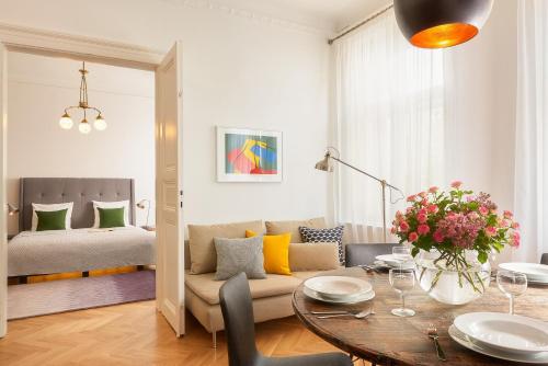 The apartment boasts free WiFi Internet and a balcony and features a living room with sofa bed, 2 bedrooms, a fully equipped kitchen with dining area, bathroom. Situated in a building with 24-hour reception, a lift and historic architectural elements. Please note that you have to walk up one flight of stairs to reach the apartment. |